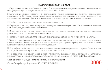 1.9.Номинальная стоимость сертификата подтверждает право предъявителя данного сертификата на получение товаров, имеющихся в наличии у компании ООО «Гришко+» на момент обслуживания по сертификату, на сумму, соответствующую указанной на сертификате номинальной стоимости.